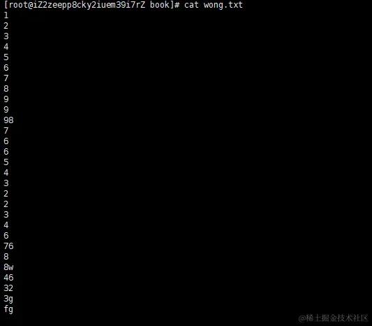 我们就用刚刚的那本叫wong.txt的书,我已经在里面写了一些内容,通过cat来查看: