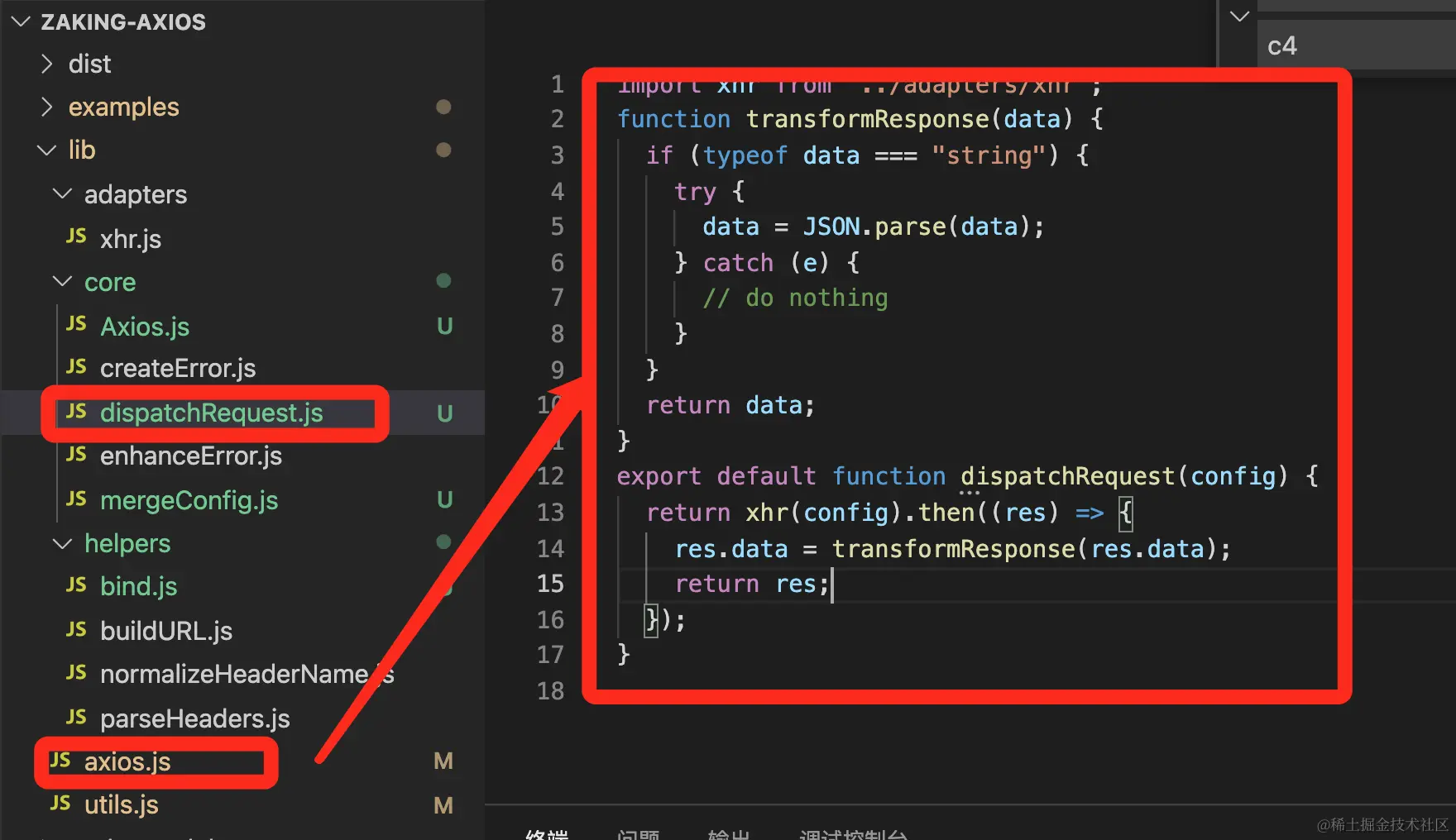 还记不记得之前lib根目录下的axios,没错,把里面的代码复制过来就可以了。那axios就没东西了,我们改下axios里的代码:
