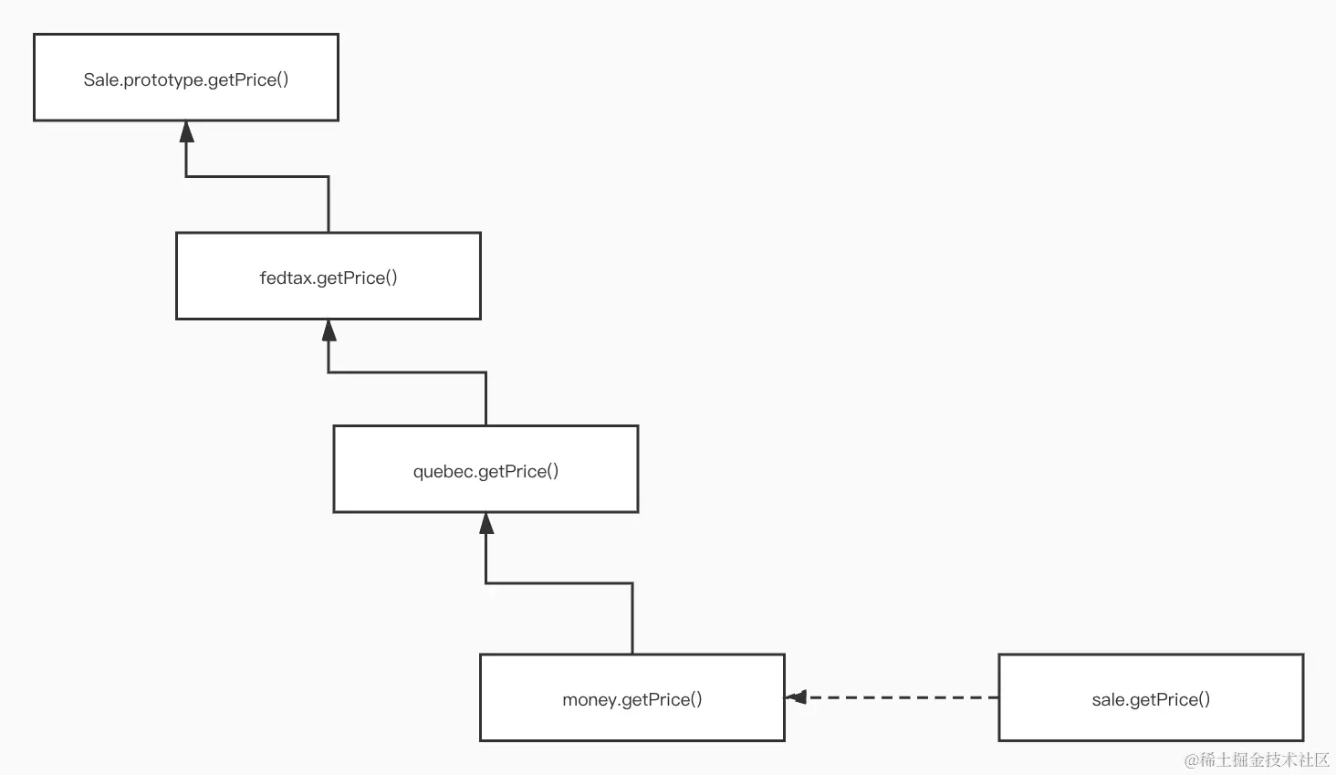 最终的结果是,当您在第一个用法示例中执行sale.getPrice()时,调用了money装饰者的方法(见下图)。但是由于每个装饰方法首先调用父对象的方法,money的getPrice()将会首先调用quebec的getPrice(),这有需要依次调用fedtax的getPrice()等。该调用链一路攀升到由Sale()构造函数所实现的原始未经修饰的getPrice()。