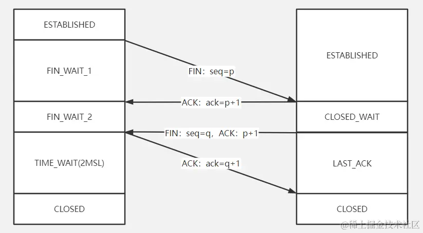 我们简单解释下这张图,当客户端发送一个“我不玩了”的消息后,就会进入到FIN_WAIT_1的状态,等待后续的服务器反馈,当服务器收到消息后,就会在之前的基础上给包序号加+1返回给客户端,那么此时服务器就进入到了CLOSED_WAIT的待关闭状态。