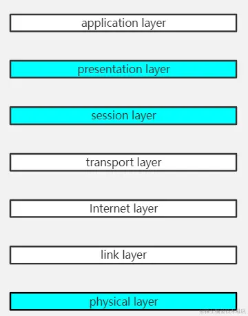 我们看图说话噢,上面花里胡哨的那三层就是多出来的三层,第一层是物理层,第五层是会话层,第六层是表示层。嗯,解释解释。