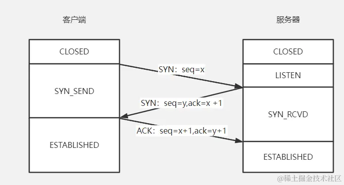 服务器收到这个消息后,就会把x+1作为ack结果,也就是返回的消息,在返回的消息中还给回客户端一个seq为y,同样的,这个y也是一个序号。那么此时服务器就处于SYN_RCVD也就是接收到了消息的状态。