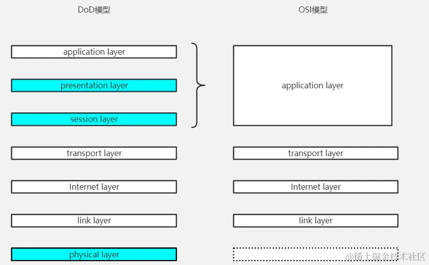 DoD模型和OSI模型的对比,则是这样的: