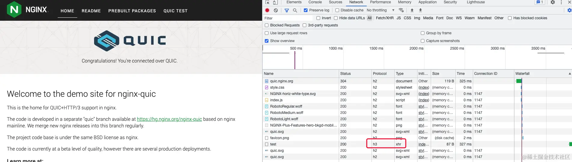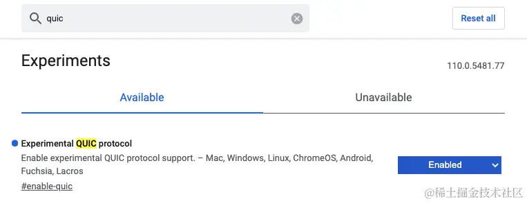 如果你想尝试HTTP/3的例子,我们可以在这个网址玩一下,quic.nginx.org/。如果不行的话,就需要… QUIC 的选项,把它改为“Enabled”。就像这样: