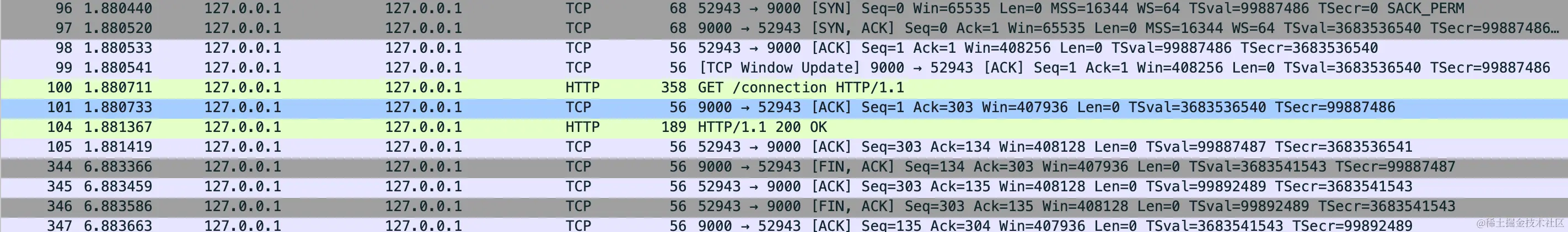 我们可以清楚的看到三次握手后(也就是96、97、98三个id的tcp)的HTTP请求,过了四秒,就四次挥手(就是344、345、346、347四次)断开连接了,大家有兴趣自行尝试体验一下。