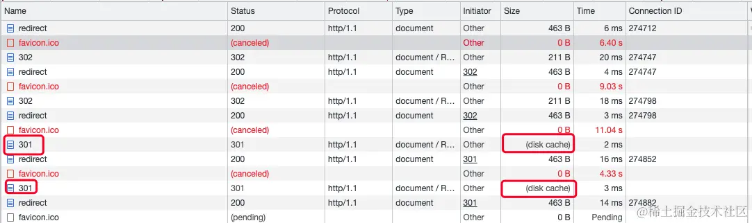 看到区别么?301永久重定向,如果你不做缓存的设置,那么浏览器会默认缓存原地址,因为浏览器认为你的重定向是永久的,我直接缓存就好了,而302临时重定向的话,浏览器压根不会缓存,因为觉得这个地址以后还要用,缓存也没用。我们再来看个例子: