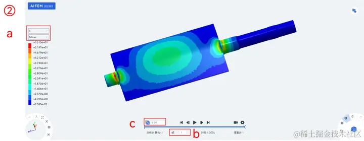 ② a.在视口区左侧选择S及其下Mises;b.视口区下侧选择相应帧,c.默认变形系数,进行应力云图查看;