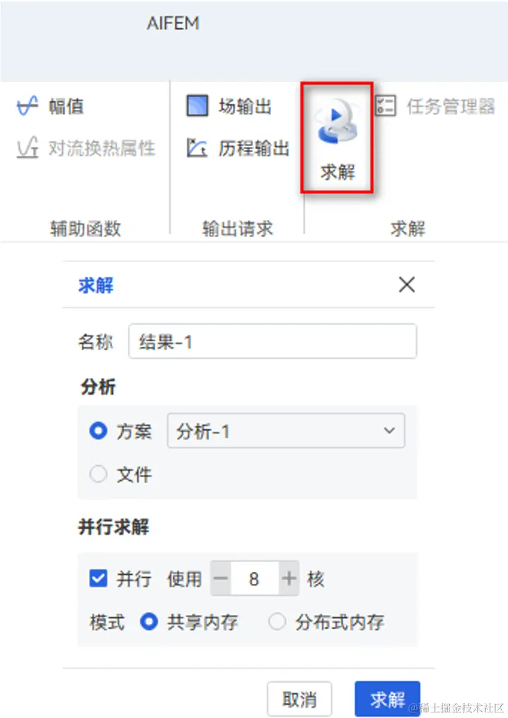 ② 在求解弹窗中,定义输出名称及求解模型,点击求解提交计算。