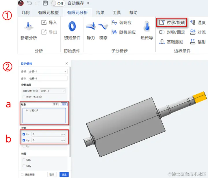 ① 点击有限元分析>位移/旋转,可弹出位移/旋转弹窗;
