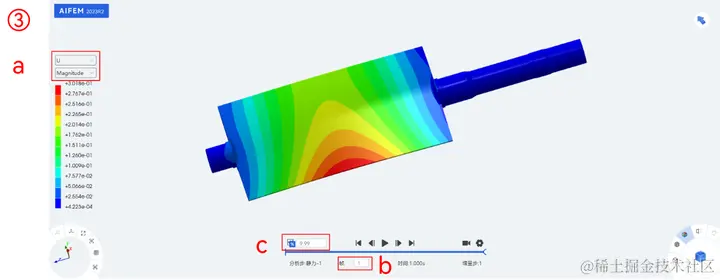 ③ a.在视口区左侧选择U及其下Magnitude;b.视口区下侧选择相应帧,c.默认变形系数,进行位移云图查看。