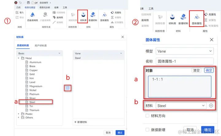 ② 点击有限元模型>固体属性,在固体属性弹窗中,a.选择整个模型为对象,点击右上角确定;b.选择对应的几何赋予steel材料属性;点击确定。