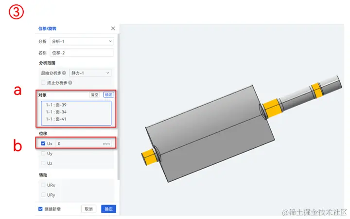 ② 在第1个位移/旋转弹窗中,a.选择面A; b.指定位移Ux=Uy=0mm。勾选继续新增,点击确定;