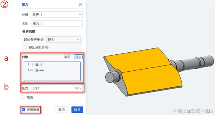 ② 在第1个压力弹窗中,a.选择弧度大的正面;b施加0.37MPa压力。勾选继续新增,点击确定;