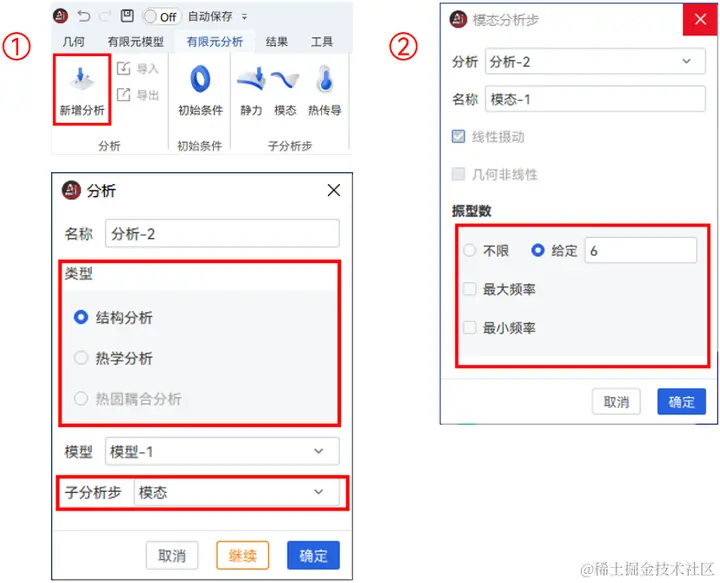 ① 点击有限元分析>新增分析,创建一个名称为分析-2的结构分析,子分析步选择模态,点击继续;