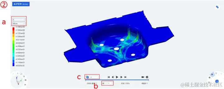 ② a.在视口区左侧选择S及其下Mises;b.视口区下侧选择相应帧,c.输入相应变形系数,进行应力云图查看;