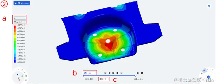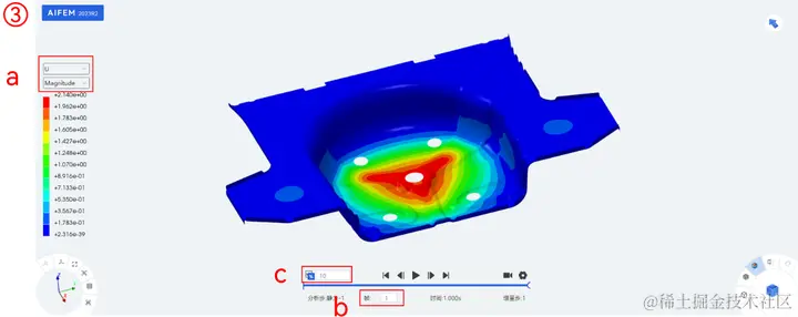 ③ a.在视口区左侧选择U及其下Magnitude;b.视口区下侧选择相应帧,c.输入相应变形系数,进行位移云图查看。