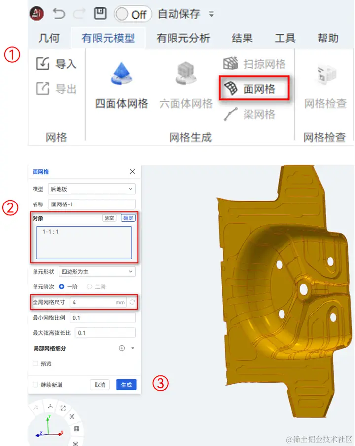 ① 点击有限元模型>面网格,弹出面网格弹窗,对零件1划分网格;