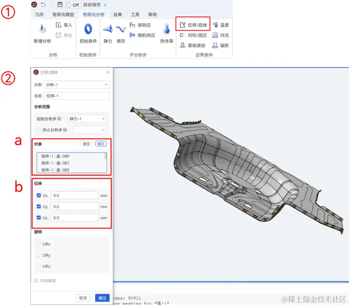 ② 在位移/旋转弹窗中,a.选择红色区域为对象,点击右上确定; b.指定位移Ux,Uy,Uz为0mm;