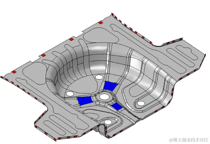 某型汽车后地板如图,包括周围一圈红色焊点区及中间蓝色受压区。