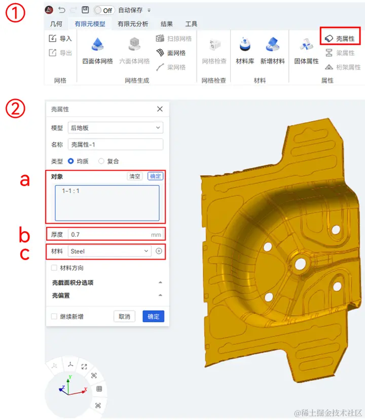 ② 在壳属性弹窗中,a.选择相应steel材料几何为对象,点击右上角确定;b.选择对应的几何赋予steel材料属性;c.输入厚度为0.7mm;