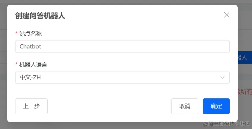 2.选择“定制问答机器人”,设置站点名称和站点语言。