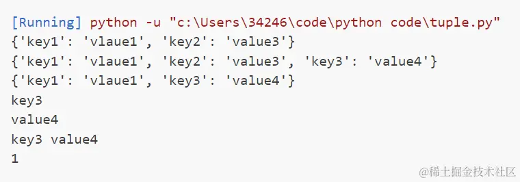 #创建字典my1_dict = {}my2_dict = {'key1':'vlaue1','key2':'value2'}#访问字典中的值vlaue = my2_dict['key1']#如果键不存在就会引发异常,可以使用Get方法来避免异常#value2 = my2_dict.get['key2']#修改字典中的值my2_dict['key2'] = 'value3'print(my2_dict)#添加字典的新的键值对my2_dict['key3'] = 'value4'print(my2_dict)#删除字典中的键值对 del 字典 / del(字典[key]) 清空 字典.clear()del my2_dict['key2'] # 删除指定的键值对print(my2_dict)my2_dict.pop('key1') # 删除指定的键值对并返回对应的值#my2_dict.clear() # 清空字典#遍历所有的键,值,以及键值对for key in my2_dict.keys(): print(key)for value in my2_dict.values(): print(value)for key, value in my2_dict.items():#字典.items() 返回字典中所有的键值对 print(key, value)#检查键是否存在if 'key1' in my2_dict: print('key1 exists')#获取长度length = len(my2_dict)print(length)