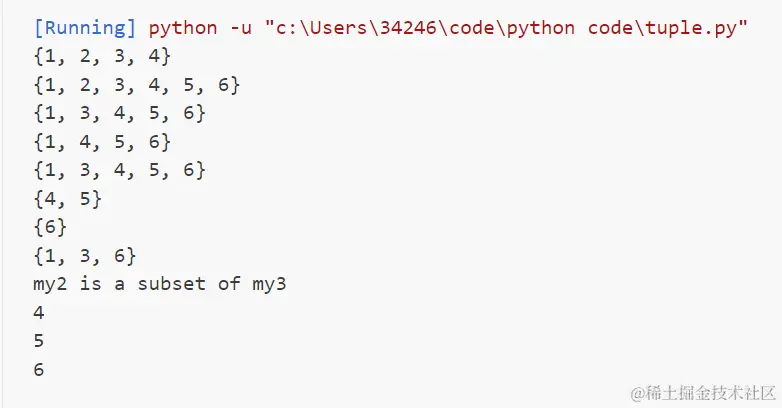 #创建集合my_set = set()set2 = {1,3}set3 = {1,3,4,5}my2_set = {1,2,3}my3_set = {1,3,4,5}#添加元素到集合my2_set.add(4) #添加单个元素print(my2_set)my2_set.update([5,6])#添加多个元素print(my2_set)#移除集合中的元素my2_set.remove(2) # 移除指定元素,如果不存在会引发 KeyError 异常print(my2_set)my2_set.discard(3) # 移除指定元素,如果不存在不会引发异常print(my2_set)my2_set.pop() # 随机移除一个元素并返回#my2_set.clear() # 清空集合中的所有元素#集合的运算 并集 | 交集 & 差集 - 对称差集 ^union_set = my2_set | my3_setunion_set = my2_set.union(my3_set)print(union_set)#交集(获取两个集合中的共同元素):intersection_set = my2_set & my3_setintersection_set = my2_set.intersection(my3_set)print(intersection_set)#差集(从一个集合中移除另一个集合中的元素):difference_set = my2_set - my3_setdifference_set = my2_set.difference(my3_set)print(difference_set)#对称差集(获取两个集合中的不重复元素):symmetric_difference_set = my2_set ^ my3_setsymmetric_difference_set = my2_set.symmetric_difference(my3_set)print(symmetric_difference_set)#检查集合的关系 #子集(判断一个集合是否为另一个集合的子集):if set2.issubset(set3): print("my2 is a subset of my3")else: print('error')#超集(判断一个集合是否为另一个集合的超集):if set2.issuperset(set3): print("my2 is a superset of my3")#相离(判断两个集合是否没有共同元素):if set2.isdisjoint(set3): print("my2 and my3 are disjointed")#集合遍历for item in my2_set: print(item)