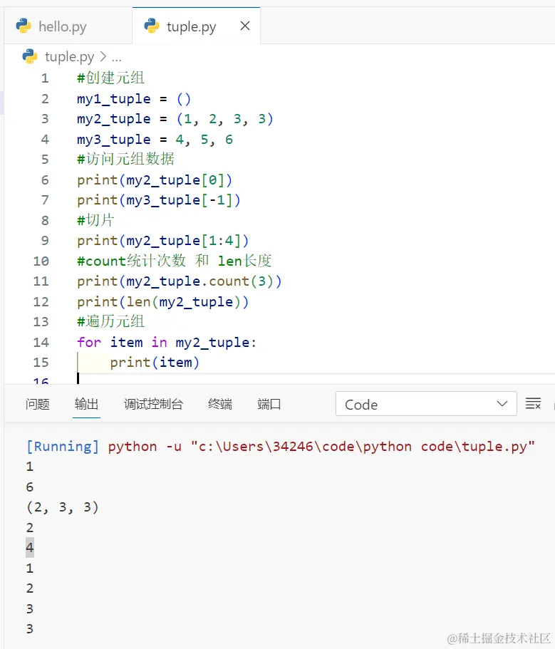 #创建元组my1_tuple = ()my2_tuple = (1, 2, 3, 3)my3_tuple = 4, 5, 6#访问元组数据print(my2_tuple[0])print(my3_tuple[-1])#切片print(my2_tuple[1:4])#count统计次数 和 len长度print(my2_tuple.count(3))print(len(my2_tuple))#遍历元组for item in my2_tuple: print(item)