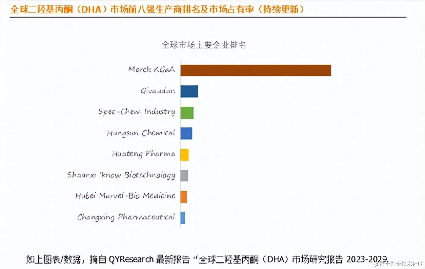 全球范围内二羟基丙酮(DHA)生产商主要包括Merck KGaA、Givaudan、Spec-Chem Industry、Hungsun Chemical等。2022年,全球前三大厂商占有大约68.0%的市场份额。