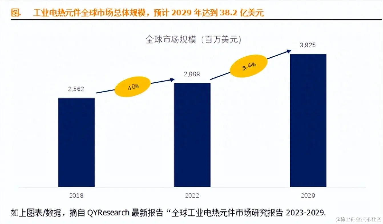 据QYResearch调研团队最新报告“全球工业电热元件市场报告2023-2029”显示,预计2029年全球工业电热元件市场规模将达到38.2亿美元,未来几年年复合增长率CAGR为3.6%。