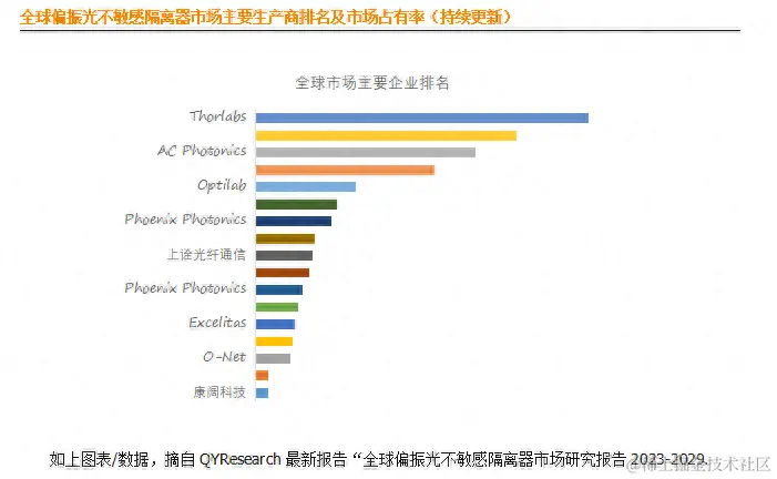 全球范围内偏振光不敏感隔离器市场集中度适中,生产商主要包括Thorlabs、Corning、AC Photonics、Polytec、Optilab、Lightel、Phoenix Photonics、Oz Optics、上诠光纤通信、Luna Innovations等。2022年,全球前十强厂商占有大约58.3%的市场份额。