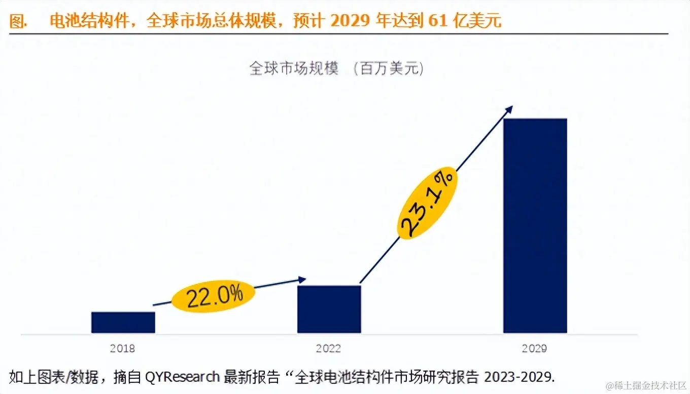 据QYResearch调研团队最新报告“全球电池结构件市场报告2023-2029”显示,预计2029年全球电池结构件市场规模将达到61亿美元,未来几年年复合增长率CAGR为23.1%。