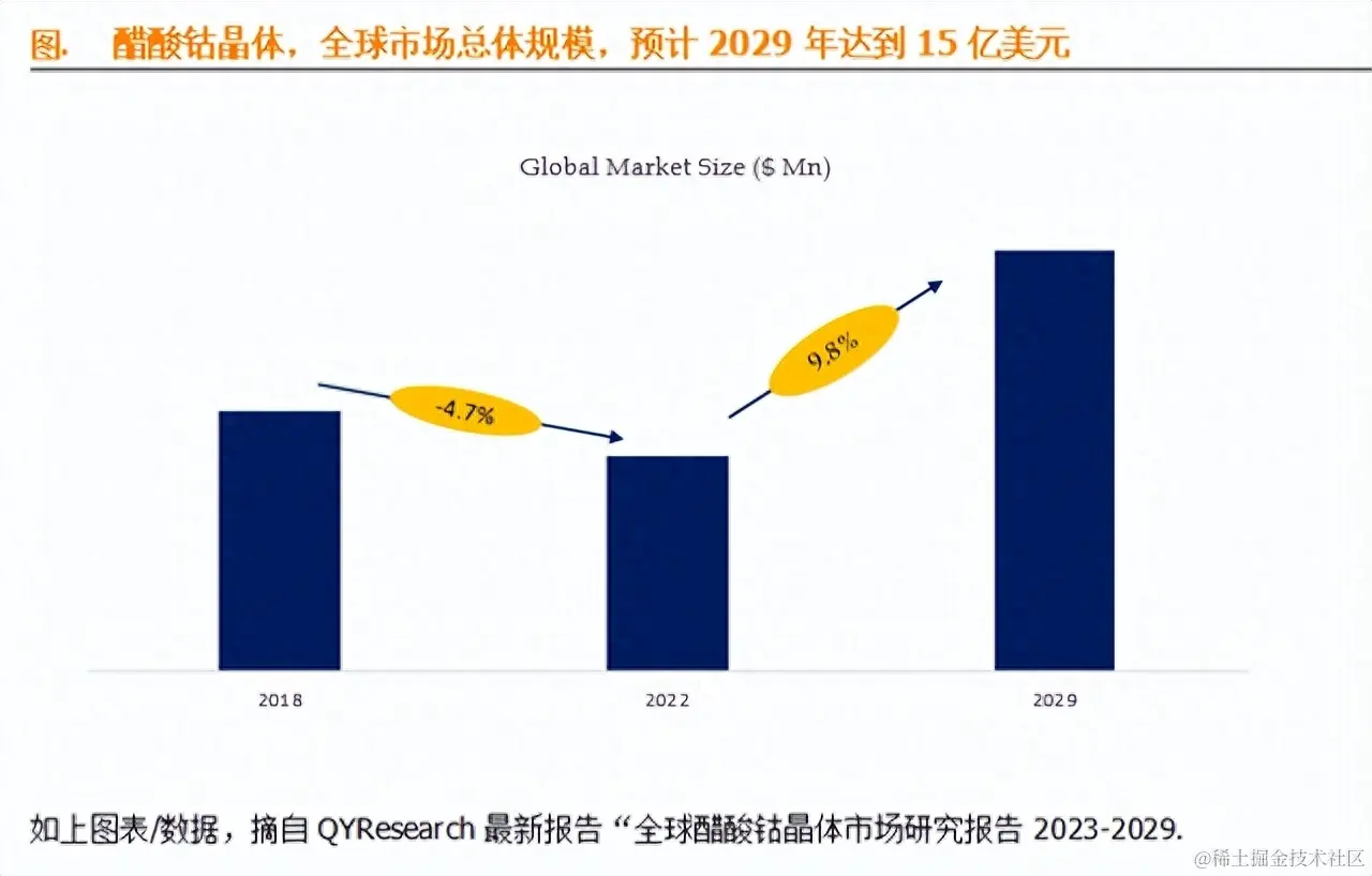 据QYResearch调研团队最新报告“全球醋酸钴晶体市场报告2023-2029”显示,预计2029年全球醋酸钴晶体市场规模将达到1.5亿美元,未来几年年复合增长率CAGR为9.8%。