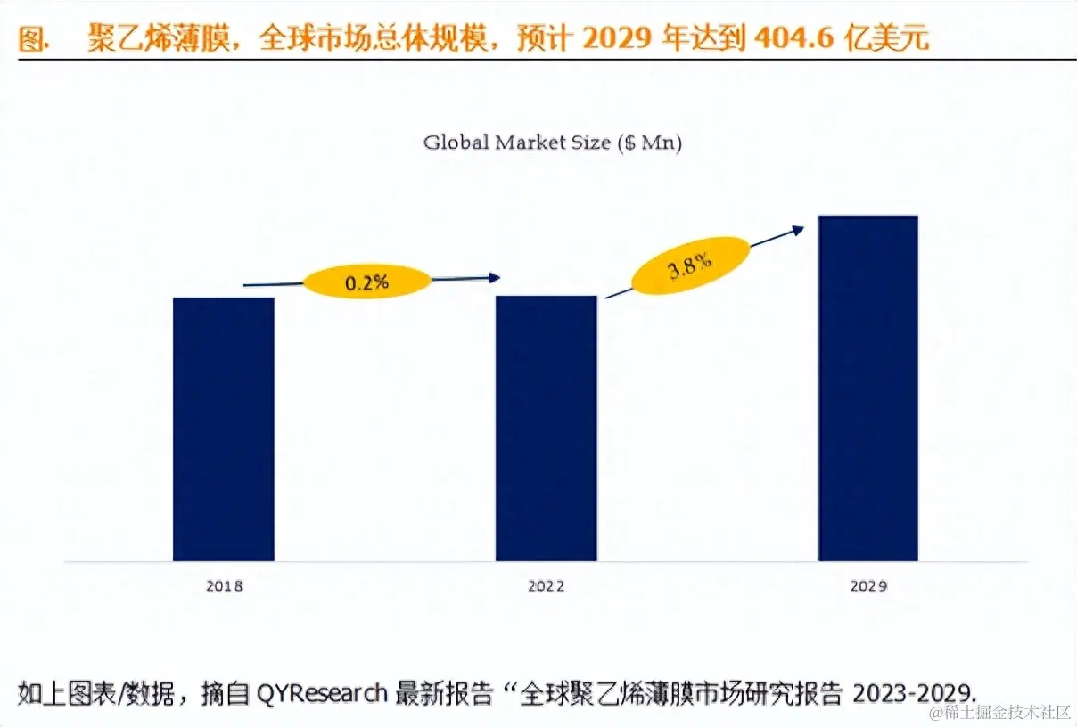 据QYResearch调研团队最新报告“全球聚乙烯薄膜市场报告2023-2029”显示,预计2029年全球聚乙烯薄膜市场规模将达到404.6亿美元,未来几年年复合增长率CAGR为3.8%。