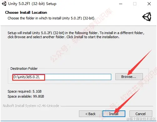 6.点击Browse修改安装路径,建议安装在C盘以外的磁盘,可以在D盘或者其它磁盘创建一个unity3d5.0.2文件夹,记住此处的安装路径,然后点击Install。