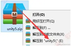 1.通过文章末尾处下载软件后,选中下载的【unity5】压缩包,右击选择解压到【unity5】。