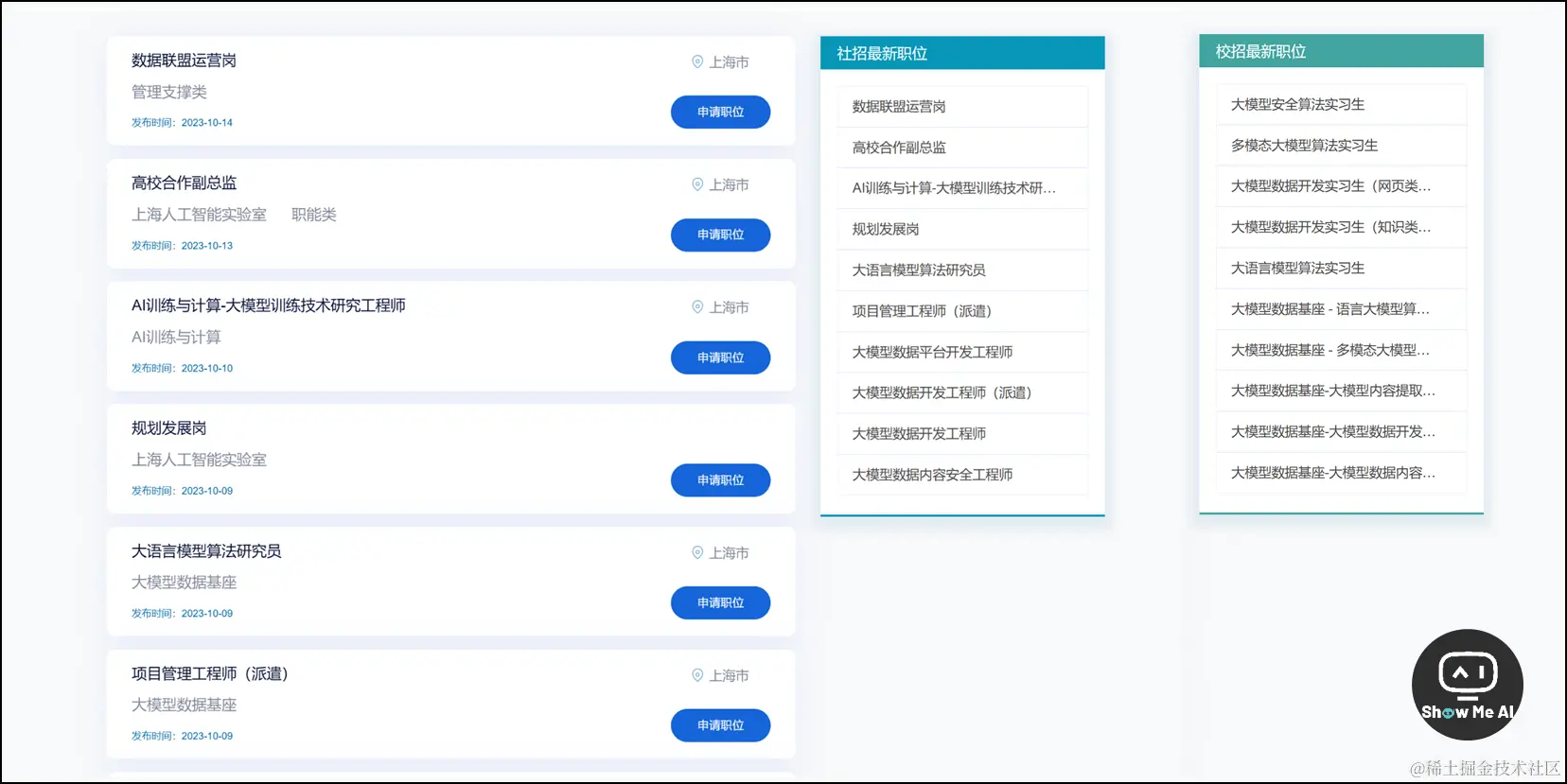 上海人工智能实验室,是国内顶尖的AI研究机构,训练并发布了「书生·通用大模型体系」。其官方网站一直在更新社招 & 校招岗位信息,覆盖了研究、算法、产品、市场等多类型岗位。