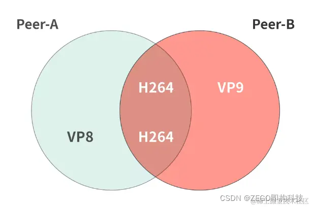 peer-A 和 peer-B 是视频互动的两边浏览器,他们通讯前必须在视频编码能力上先达成一致,如下图,最终协商出共同的H264,如果无法达成一致,则通讯失败。