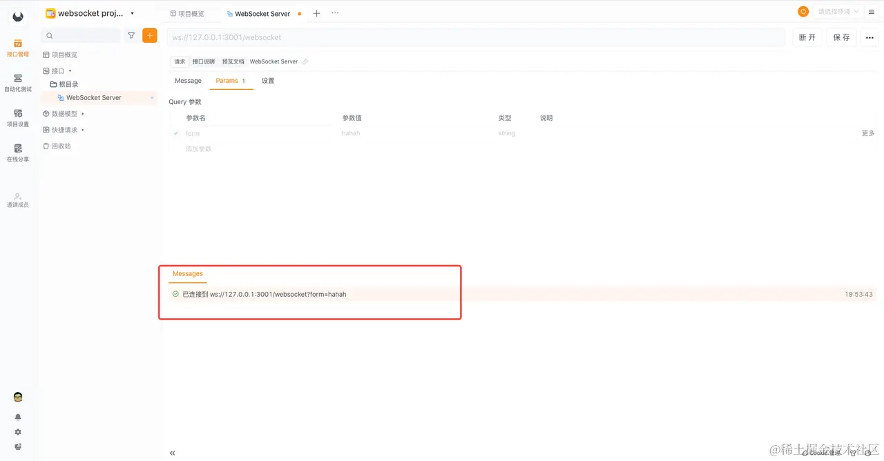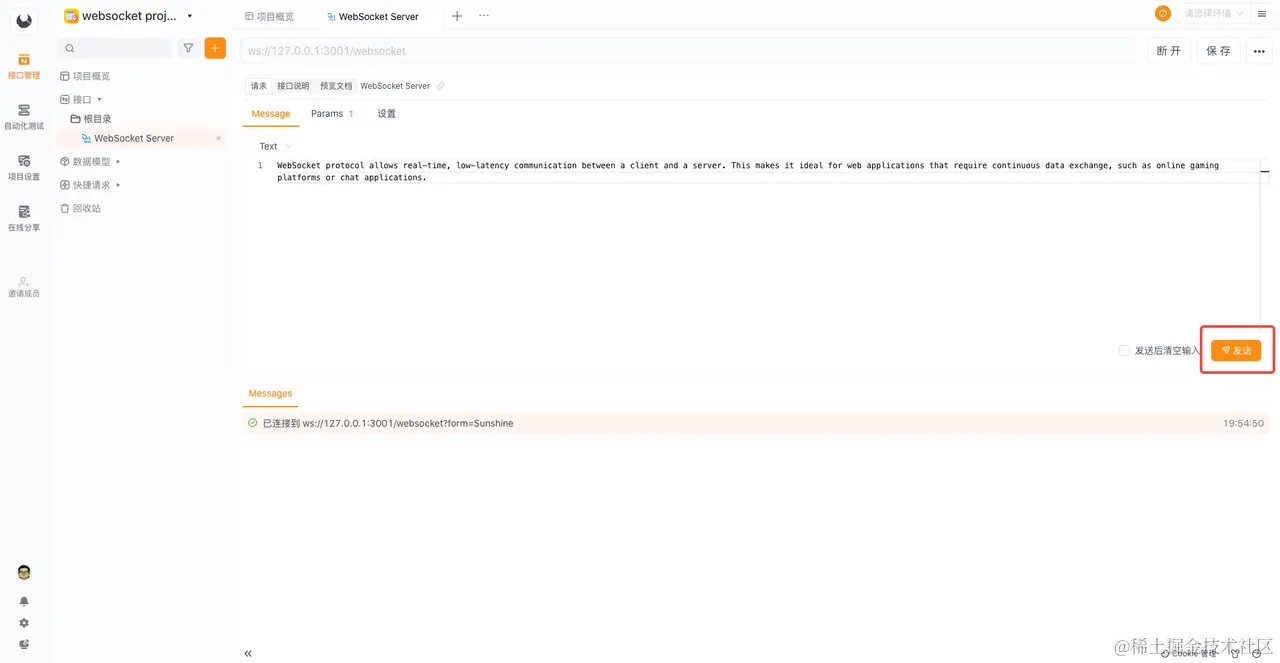 这就是 Apifox 的 WebSocket 功能,非常方便。