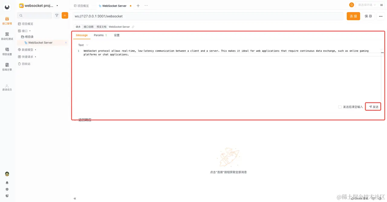 我们可以使用 Apifox 点击发送按钮向服务端进行发送 Message、Params。