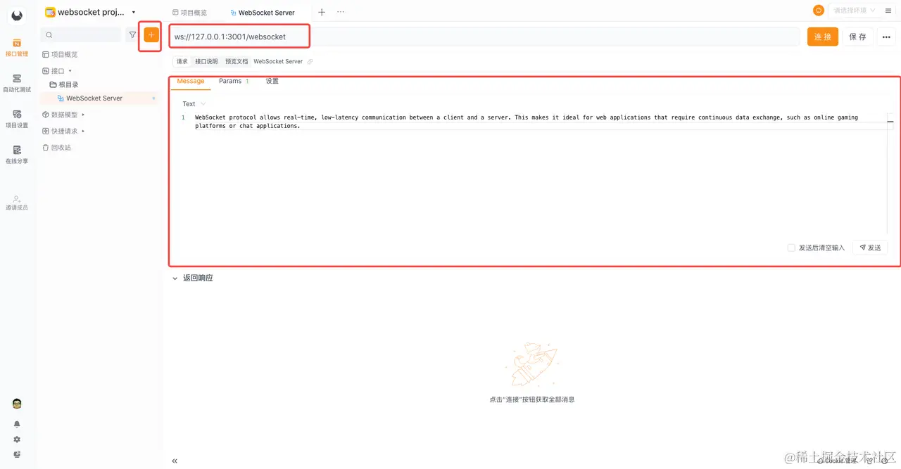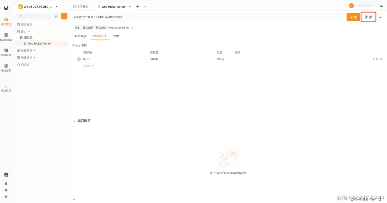 WebSocket 是客户端和服务端之间的长链接,因此你需要在 Apifox 中创建一个 WebSocket 请求,以便跳转到 Apifox 界面并填写相应的请求信息