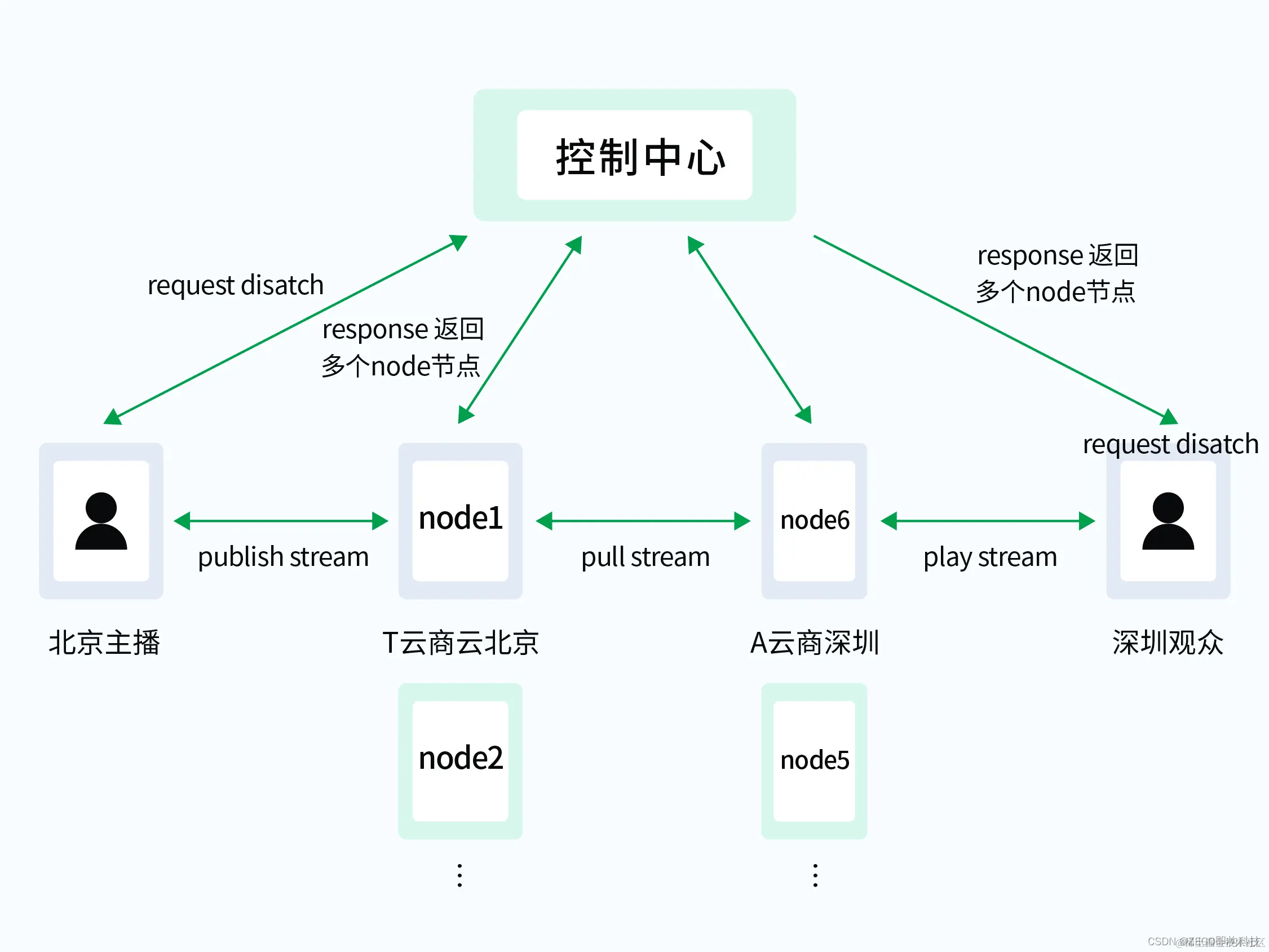 一个简单的应用场景:北京的一个主播发起调度请求,控制中心使用就近接入的策略下发一个 node 节点列表:[ip1:port,ip2:port,ip3:port...],默认优先使用第一个节点进行推拉流,这样主播就实现了向 node 1 推流。深圳观众一样进行调度请求得到 node 6 节点,对节点发起拉流请求,node6 对 node 1 进行服务器间的内拉将流串起来,就实现了一个简单的推拉流场景。