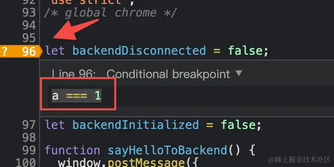 条件断点,当表达式为 true 时才会暂停,下图是当变量a === 1时才暂停。经典应用场景是当 bug 是偶现时,你需要知道入参什么的正不正常,你可以打一个你认为不正常的条件断点,看看是谁调用的。PS:值得注意的是,如果你的表达式报错,那这个断点就会不生效,需要甄别到底是报错引起的断点没进入还是真的没进入。