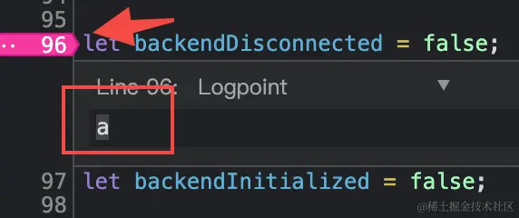 日志断点,当代码执行到这里时,会在控制台输出你的表达式,不会暂停代码执行,下图是将 a 输出到控制台的例子。