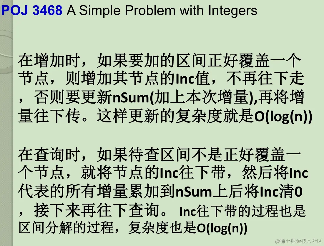 成段更新(通常这对初学者来说是一道坎),需要用到延迟标记(或者说懒惰标记),简单来说就是每次更新的时候不要更新到底,用延迟标记使得更新延迟到下次需要更新or询问到的时候