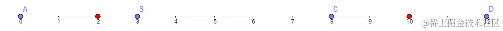 The blue points labeled A, B, C, D are the buildings. The two red points show one optimal placement of the two teleporters. For this placement of teleporters we have d(A,B) = 3, d(A,C) = 4, d(A,D) = 4, d(B,C) = 3, d(B,D) = 3, and d(C,D) = 4. The maximum of these values, and thus the diameter of Chain City, is 4. It can be shown that this solution is optimal.