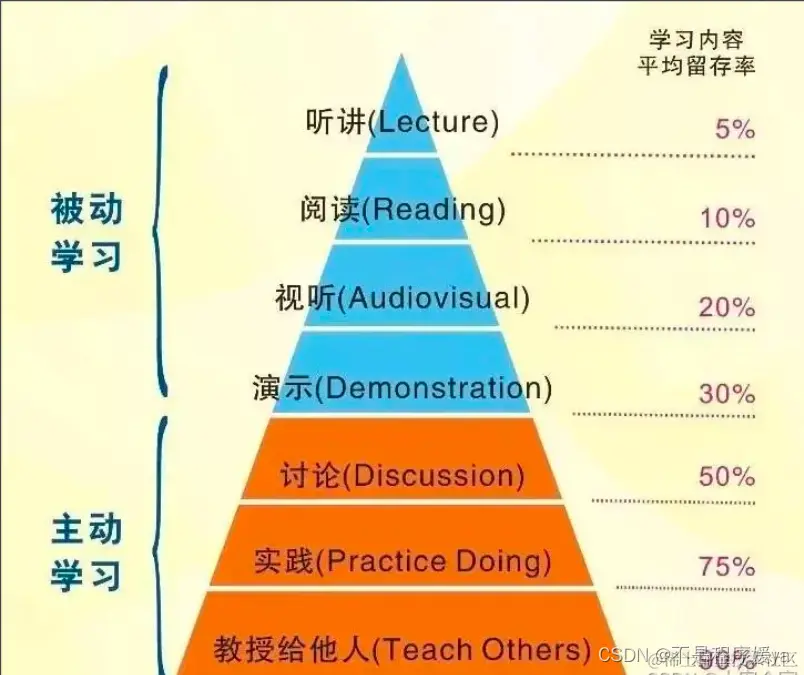 同时提出,学习效果在30%以下的几种传统方式,都是个人学习或被动学习;而学习效果在50%以上的,都是团队学习、主动学习和参与式学习。