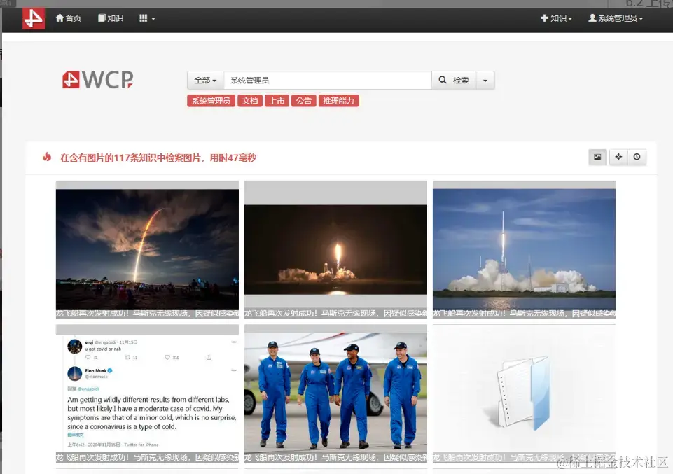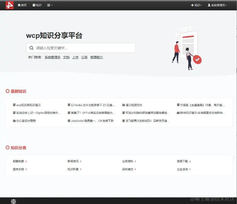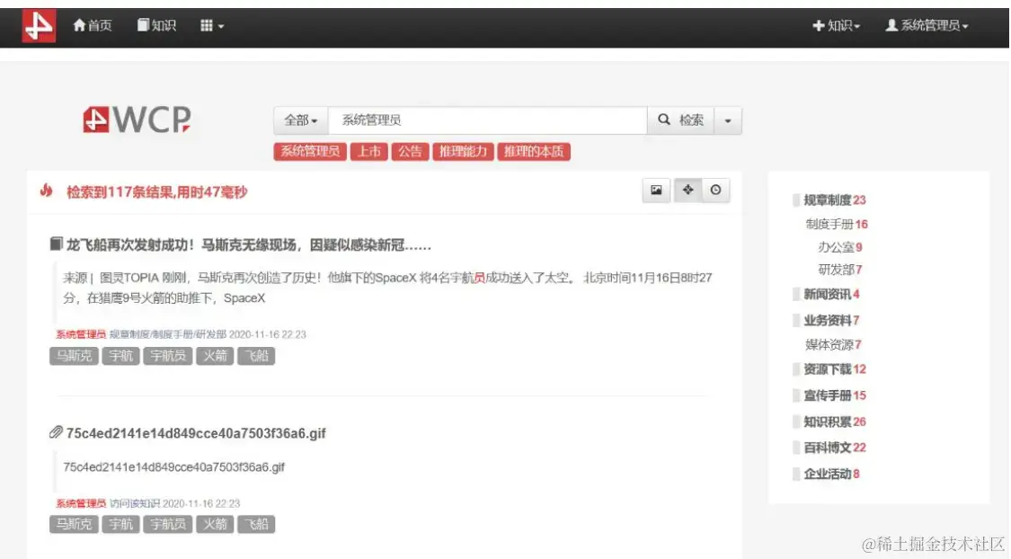 导航条下方为检索区域,用户可以通过关键字录入在知识库中查询相关知识条目,执行检索后会对知识标题、知识正文、以及知识附件中的文本进行匹配搜索(附件内容搜索需要等待附件的预览任务执行完毕后才会生效,预览任务会在系统后台自动执行)。