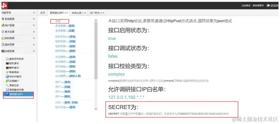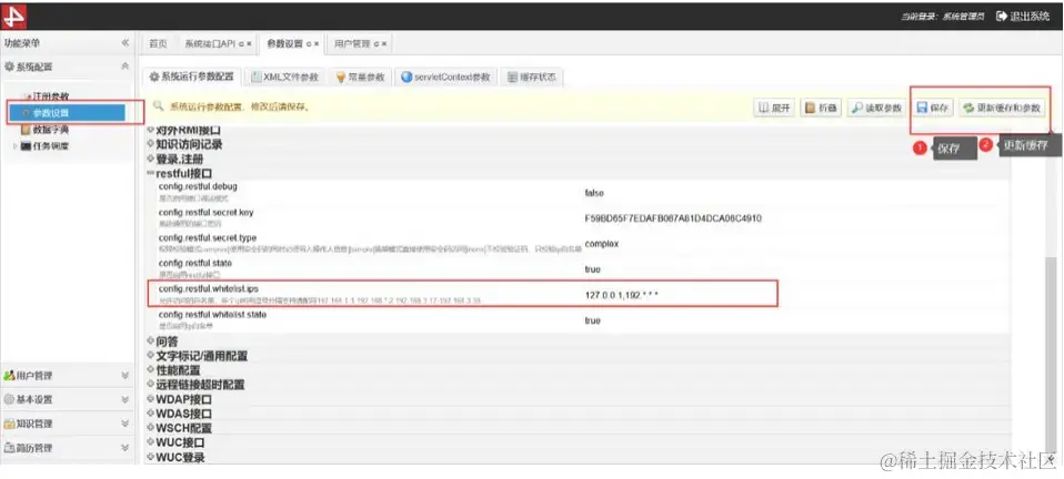 允许调用接口的IP白名单:在参数设置菜单下设置,如下图(完成设置后记得执行右上角的保存和刷新缓存)