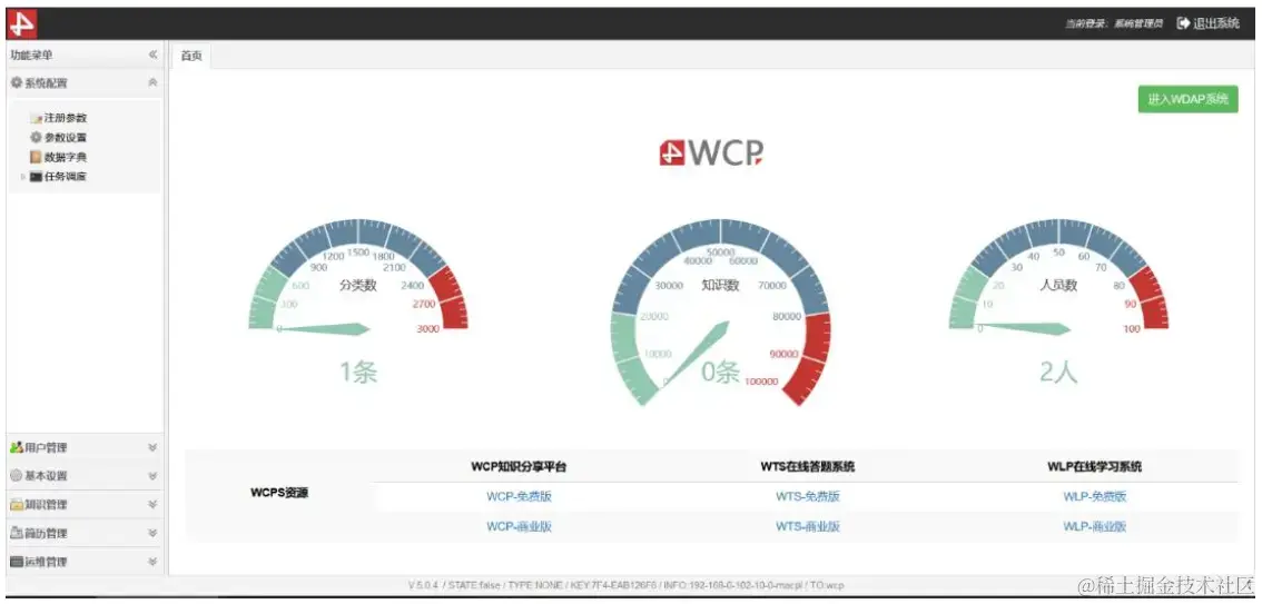 最下方为系统信息展示区域,在该区域会显示系统名称、系统版本号、友情连接(需要管理员在后台配置)等信息。